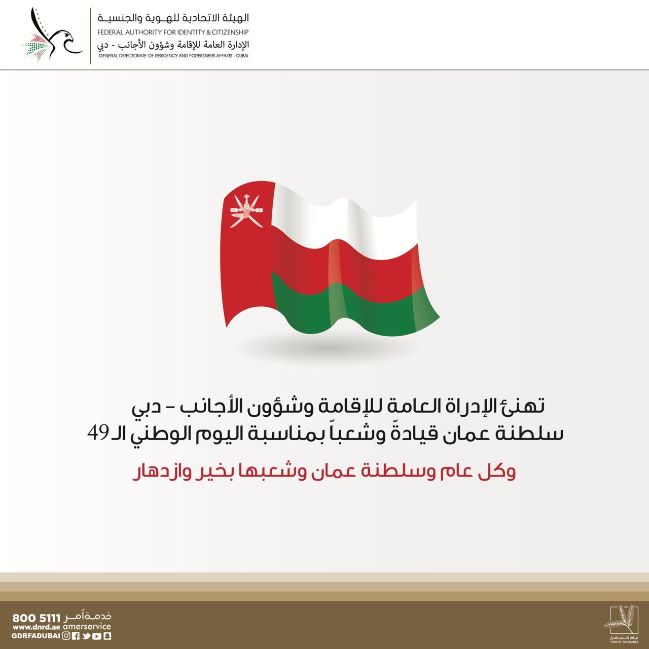 Gdrfa Dubai إقامة دبي On Twitter تهنئ الإدارة العامة للإقامة وشؤون الأجانب دبي سلطنة عمان قيادة وشعبا بمناسبة اليوم الوطني ال49 وكل عام وسلطنة عمان وشعبها بخير وازدهار اليوم الوطني العماني الامارات عمان تهنئة إقامة دبي