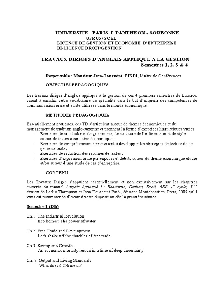 Td Anglais Sorbonne L1 L2 Gestion Baccalaureat Universitaire Economie General